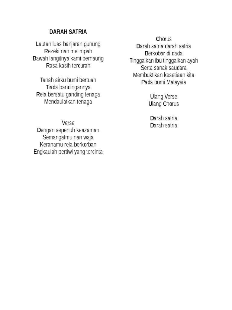 DARAH SATRIA Lautan luas banjaran gunung Rezeki nan melimpah Bawah langitnya kami bernaung Rasa kasih tercurah Tanah airku bumi bertuah Tiada bandingannya Rela bersatu ganding tenaga Mendaulatkan tenaga Verse Dengan sepenuh. Cintaku padamu begitu besar. Bawah langitnya kami bernaung.